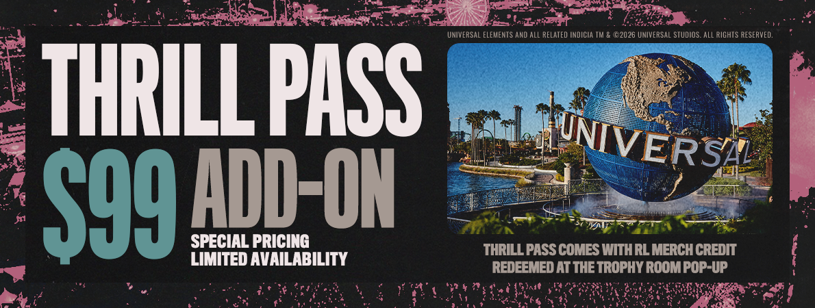 Thrill Pass and $25 shop credit must be picked up at the Trophy Room merch pop-up. Show your order number to exchange for the Thrill Pass. Merch credit can only be used on Rolling Loud Official Merchandise.